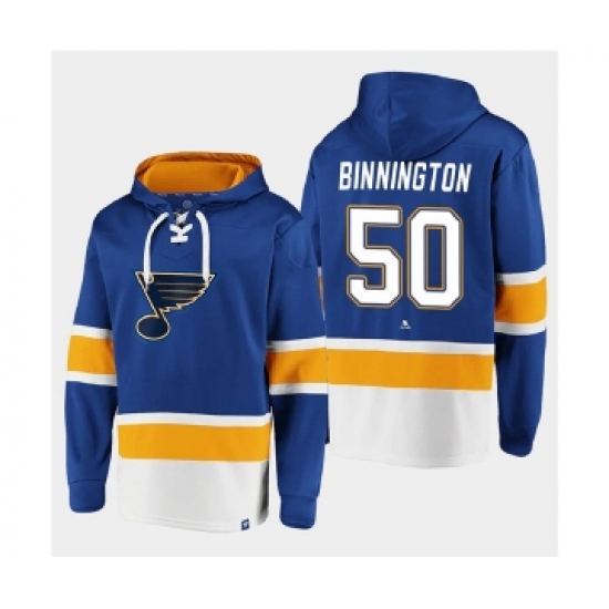 >Men St. Louis Blues #50 Jordan Binnington Blue Ageless Must-Have Lace-Up Pullover Hoodie