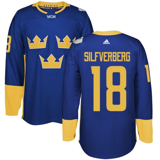 Home>NHL>Team Sweden>Jakob Silfverberg>Men's Adidas Team Sweden #18 Jakob Silfverberg Premier Royal Blue Away 2016 World Cup of Hockey Jersey