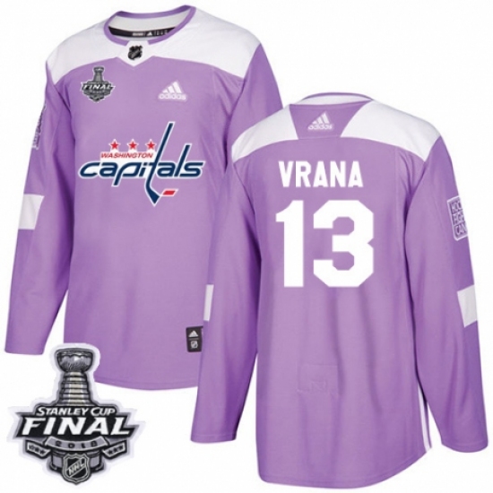 >Men's Adidas Washington Capitals #13 Jakub Vrana Authentic Purple Fights Cancer Practice 2018 Stanley Cup Final NHL Jersey