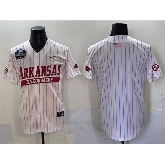>Men's Arkansas Razorbacks Blank White Pinstripe 2025 World Series & SEC Patch Stitched Jersey