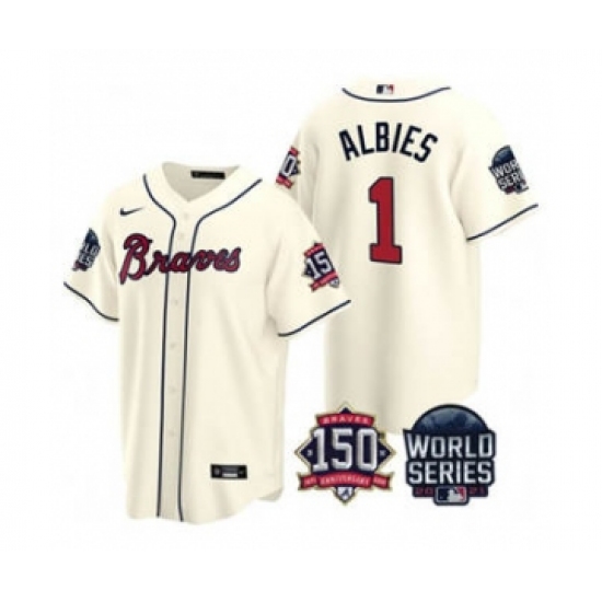 Men's Atlanta Braves #1 Ozzie Albies 2021 Cream World Series With 150th Anniversary Patch Cool Base Baseball Jersey