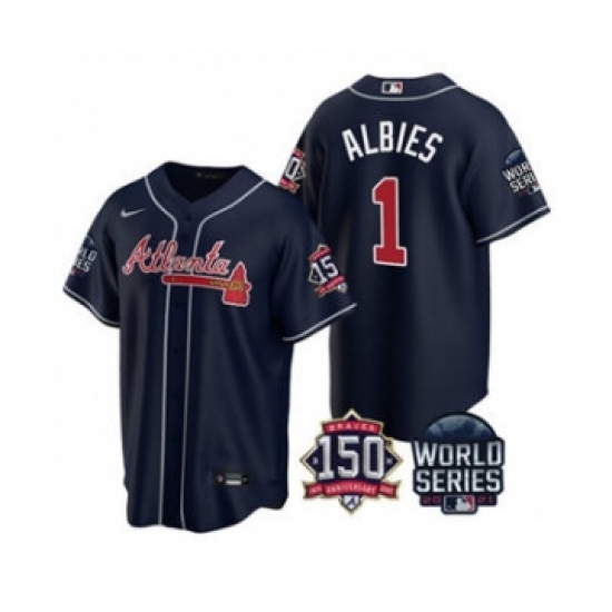 Men's Atlanta Braves #1 Ozzie Albies 2021 Navy World Series With 150th Anniversary Patch Cool Base Baseball Jersey