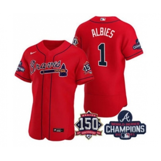 Men's Atlanta Braves #1 Ozzie Albies 2021 Red World Series Champions With 150th Anniversary Flex Base Stitched Jers