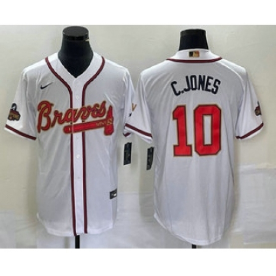 Men's Atlanta Braves #10 Chipper Jones 2022 White Gold World Series Champions Program Cool Base Stitched Baseball Jersey