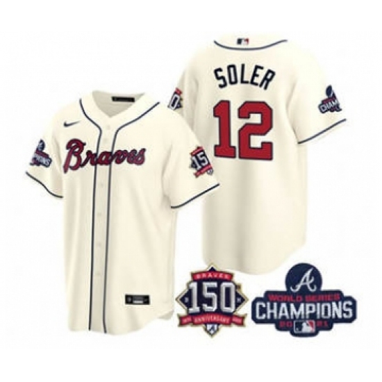 Men's Atlanta Braves #12 Jorge Soler 2021 Cream World Series Champions With 150th Anniversary Patch Cool Base Stitched Jersey