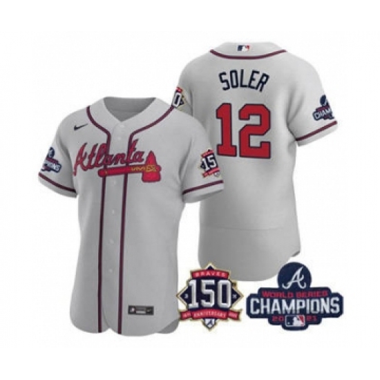 Men's Atlanta Braves #12 Jorge Soler 2021 Gray World Series Champions With 150th Anniversary Flex Base Stitched Jersey