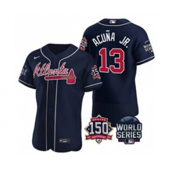 Men's Atlanta Braves #13 Ronald Acuna Jr. 2021 Navy World Series Flex Base With 150th Anniversary Patch Baseball Jersey