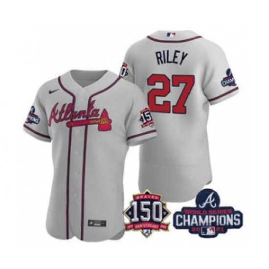 Men's Atlanta Braves #27 Austin Riley 2021 Gray World Series Champions With 150th Anniversary Flex Base Stitched Jersey