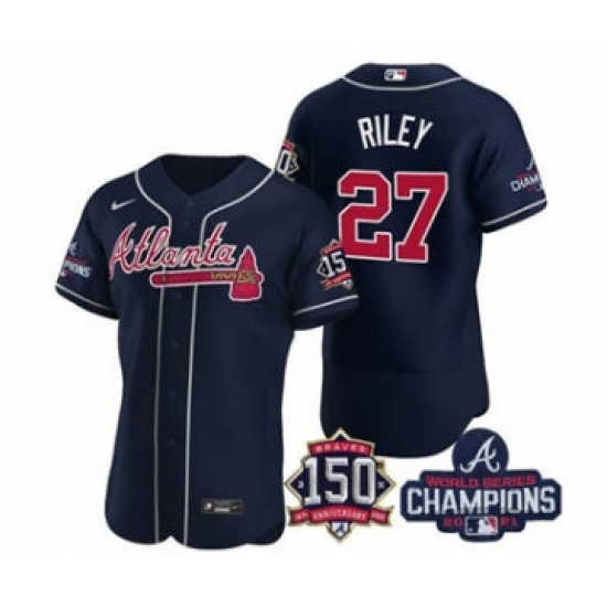Men's Atlanta Braves #27 Austin Riley 2021 Navy World Series Champions With 150th Anniversary Flex Base Stitched Jersey