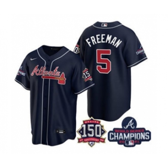 >Men's Atlanta Braves #5 Freddie Freeman 2021 Navy World Series Champions With 150th Anniversary Patch Cool Base Stitched Jersey
