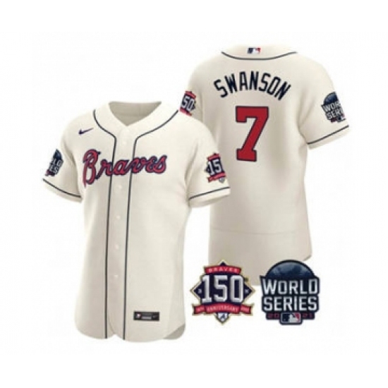 Men's Atlanta Braves #7 Dansby Swanson 2021 Cream World Series Flex Base With 150th Anniversary Patch Baseball Jersey