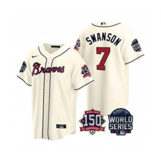 Men's Atlanta Braves #7 Dansby Swanson 2021 Cream World Series With 150th Anniversary Patch Cool Base Baseball Jersey