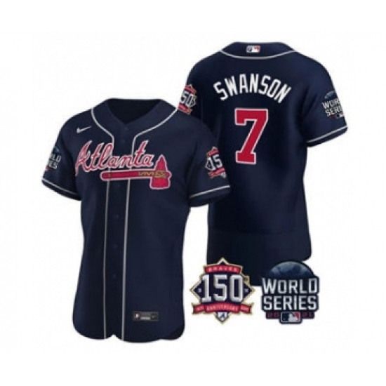 Men's Atlanta Braves #7 Dansby Swanson 2021 Navy World Series Flex Base With 150th Anniversary Patch Baseball Jersey