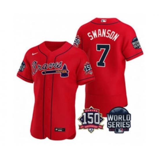 Men's Atlanta Braves #7 Dansby Swanson 2021 Red World Series Flex Base With 150th Anniversary Patch Baseball Jersey