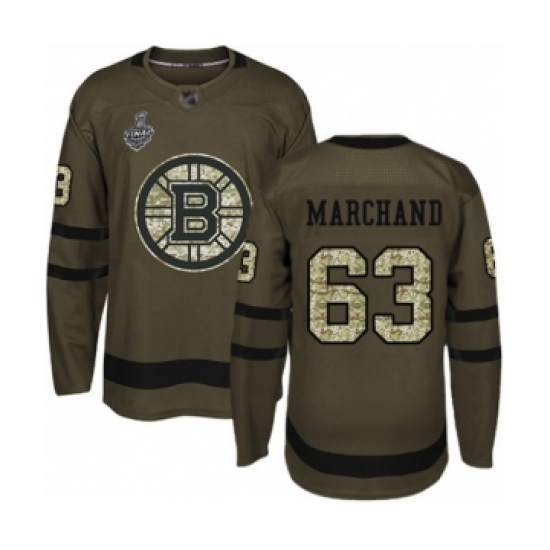 >Men's Boston Bruins #63 Brad Marchand Authentic Green Salute to Service 2019 Stanley Cup Final Bound Hockey Jersey