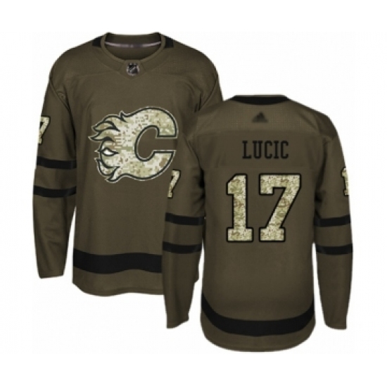 >Men's Calgary Flames #17 Milan Lucic Authentic Green Salute to Service Hockey Jersey