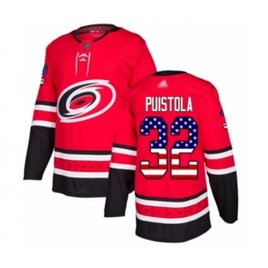 >Men's Carolina Hurricanes #32 Patrik Puistola Authentic Red USA Flag Fashion Hockey Jersey