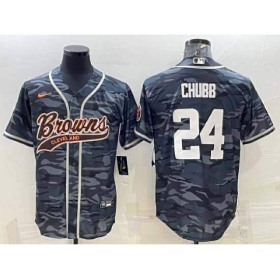 >Men's Cleveland Browns #24 Nick Chubb Grey Camo With Patch Cool Base Stitched Baseball Jersey