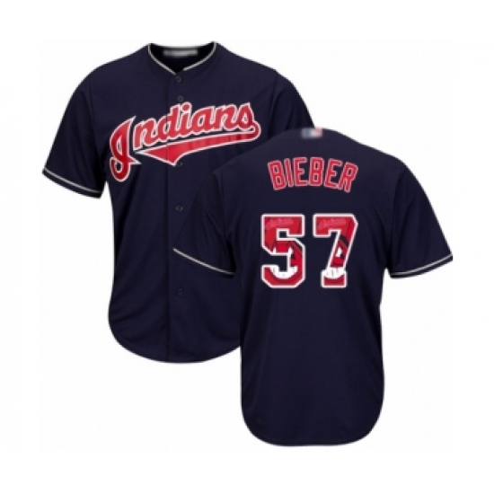 >Men's Cleveland Indians #57 Shane Bieber Authentic Navy Blue Team Logo Fashion Cool Base Baseball Jersey