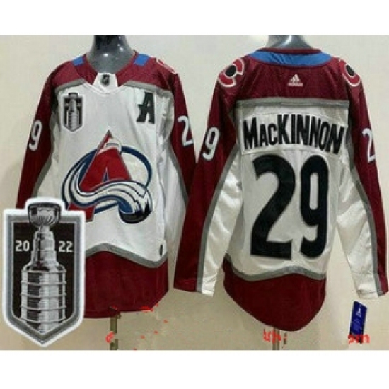 Men's Colorado Avalanche #29 Nathan MacKinnon 2022 White Stanley Cup Champions Patch Stitched Jersey