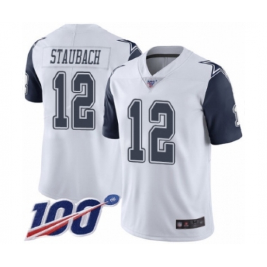 >Men's Dallas Cowboys #12 Roger Staubach Limited White Rush Vapor Untouchable 100th Season Football Jersey