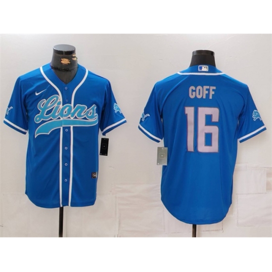 >Men's Detroit Lions #16 Jared Goff Blue Cool Base Stitched Baseball Jersey