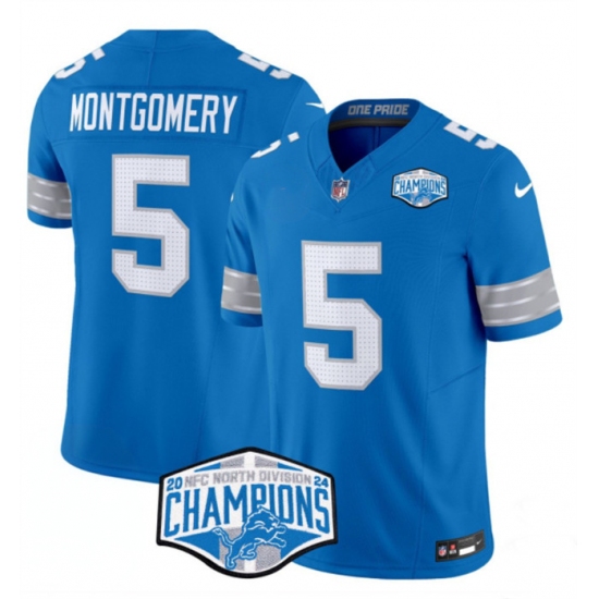 >Men's Detroit Lions #5 David Montgomery Blue 2024 NFC North Champions F.U.S.E. Vapor Limited Stitched Jersey