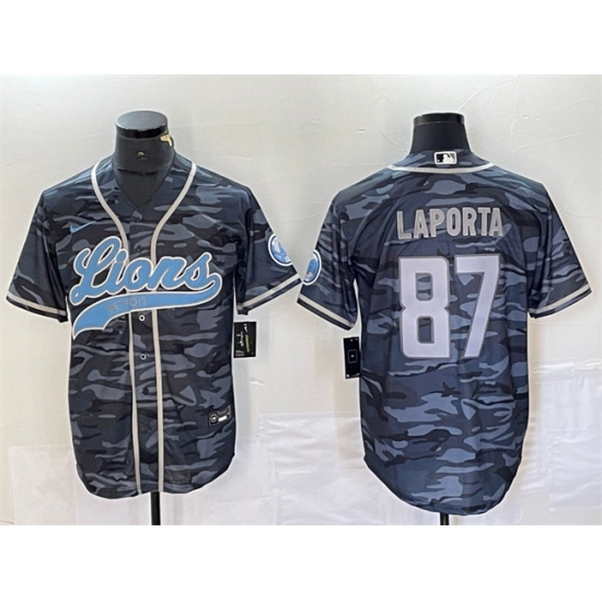 >Men's Detroit Lions #87 Sam LaPorta Gray Camo Cool Base Stitched Baseball Jersey
