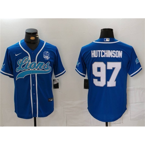 Men's Detroit Lions #97 Aidan Hutchinson Blue With 90th Anniversary Cool Base Stitched Baseball Jersey