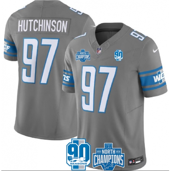 >Men's Detroit Lions #97 Aidan Hutchinson Gray 2023 90th Anniversary North Division Champions Limited Stitched Jersey