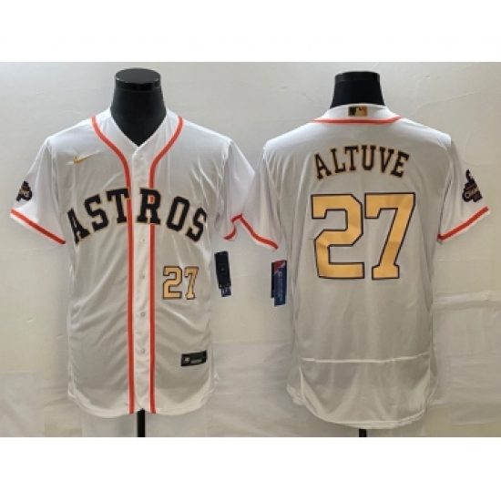 Men's Houston Astros #27 Jose Altuve Number 2023 White Gold World Serise Champions Flex Base Stitched Jersey