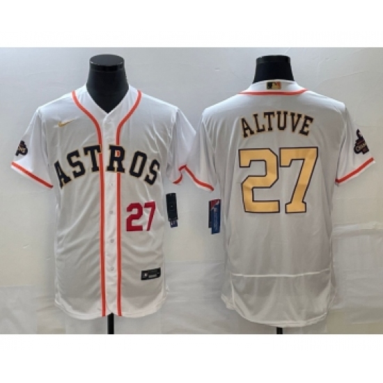 >Men's Houston Astros #27 Jose Altuve Number 2023 White Gold World Serise Champions Flex Base Stitched Jersey2