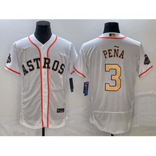 >Men's Houston Astros #3 Jeremy Pena 2023 White Gold World Serise Champions Flex Base Stitched Jersey