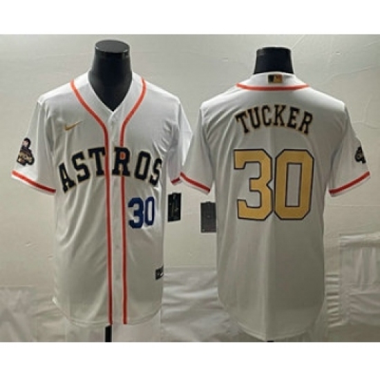 Men's Houston Astros #30 Kyle Tucker Number 2023 White Gold World Serise Champions Flex Base Stitched Jersey2