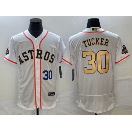 Men's Houston Astros #30 Kyle Tucker Number 2023 White Gold World Serise Champions Flex Base Stitched Jersey