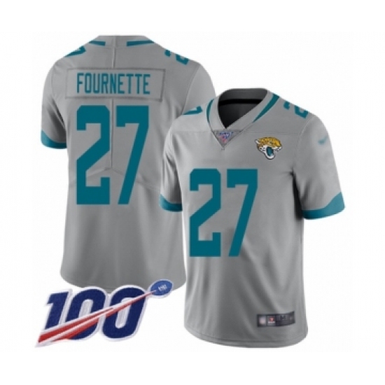 >Men's Jacksonville Jaguars #27 Leonard Fournette Silver Inverted Legend Limited 100th Season Football Jersey