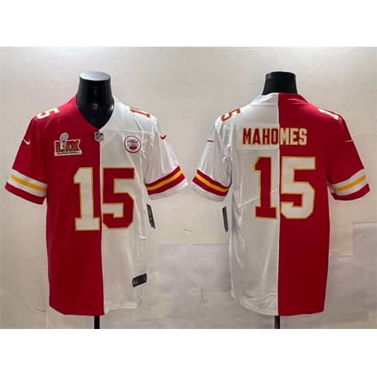 Men's Kansas City Chiefs #15 Patrick Mahomes Red & White Split 2025 Super Bowl LIX Vapor Limited Stitched Football Jersey