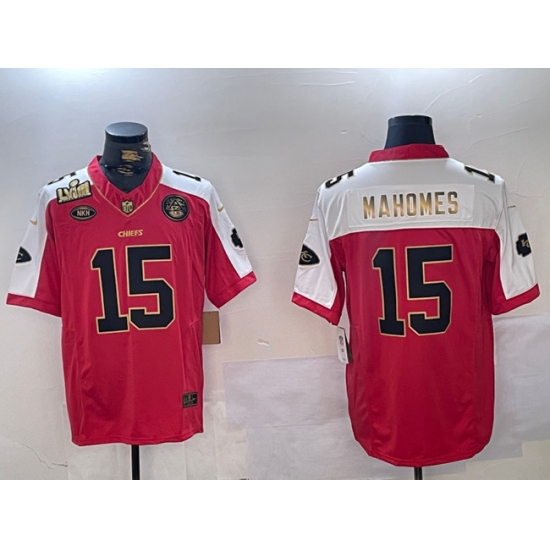Men's Kansas City Chiefs #15 Patrick Mahomes Red & White Split 2025 Super Bowl LIX Vapor Limited Stitched Football Jersey