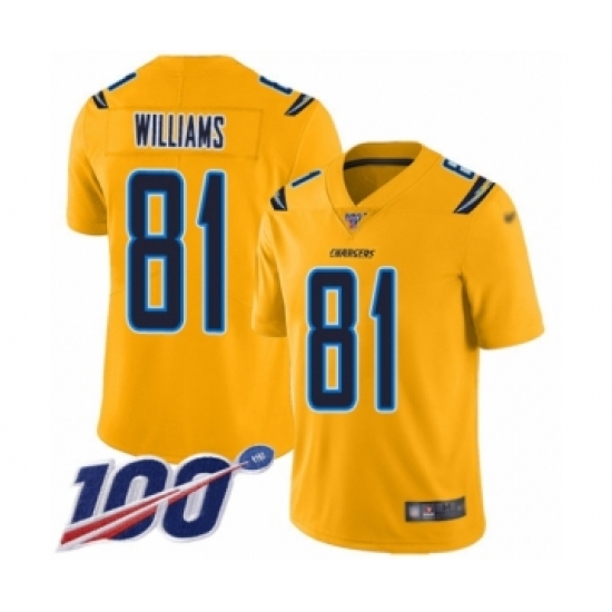 >Men's Los Angeles Chargers #81 Mike Williams Limited Gold Inverted Legend 100th Season Football Jersey