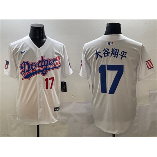 Men's Los Angeles Dodgers #17 大谷翔平 White With American Flag Limited Stitched Baseball Jersey