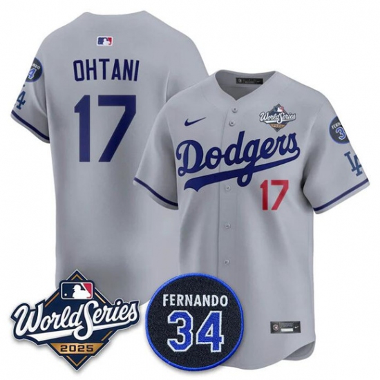 >Men's Los Angeles Dodgers #17 Shohei Ohtani Gray 2025 World Series With No. 34 Limited Stitched Jersey