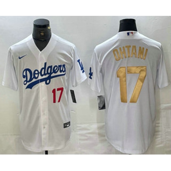 Men's Los Angeles Dodgers #17 Shohei Ohtani Number White Gold Stitched Cool Base Nike Jersey