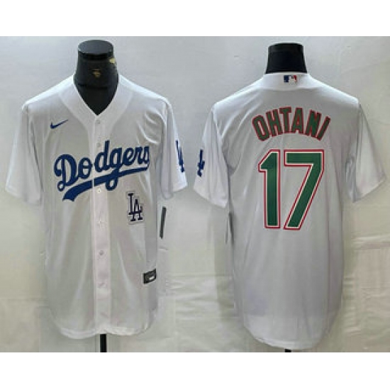 Men's Los Angeles Dodgers #17 Shohei Ohtani White Green Stitched Cool Base Nike Jersey