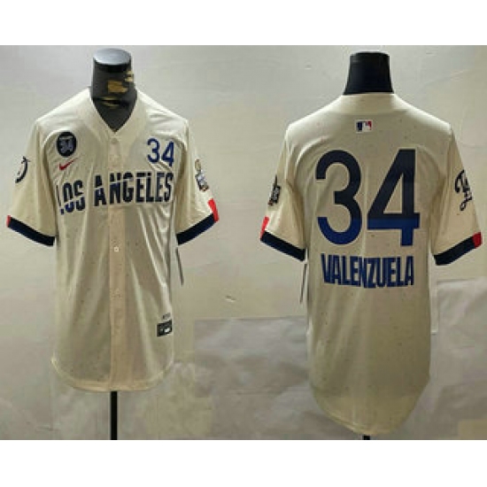 >Men's Los Angeles Dodgers #34 Fernando Valenzuela Number Cream 2024 World Series City Connect Limited Stitched Jersey