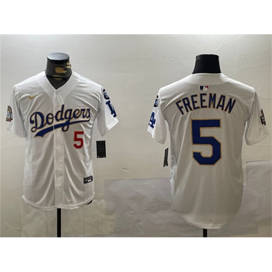 >Men's Los Angeles Dodgers #5 Freddie Freeman White Gold 2024 World Series With Fernando Memorial Home Limited Stitched Baseball Jersey