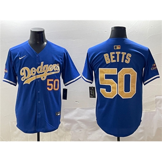 >Men's Los Angeles Dodgers #50 Mookie Betts Royal 2025 Gold Collection Limited Stitched Baseball Jersey