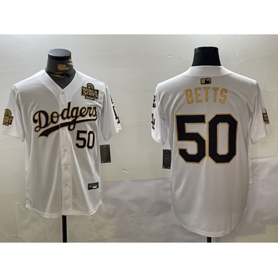 Men's Los Angeles Dodgers #50 Mookie Betts White Gold 2024 World Series With Fernando Memorial Limited Stitched Baseball Jerseys