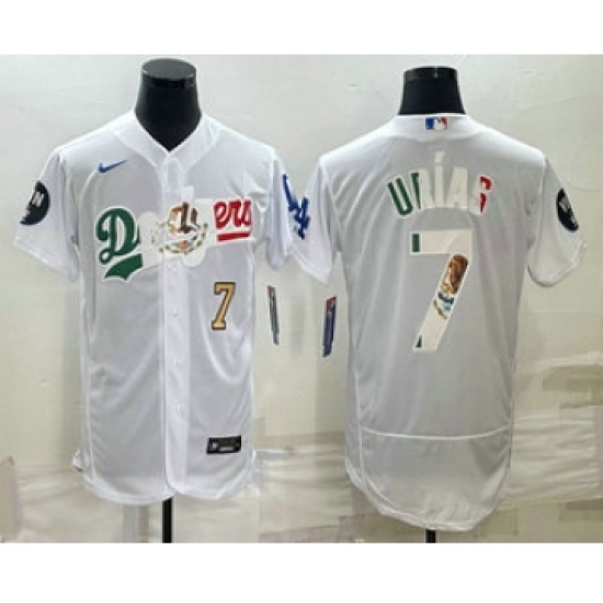 >Men's Los Angeles Dodgers #7 Julio Urias Number White With Vin Scully Flex Base Stitched Baseball Jersey