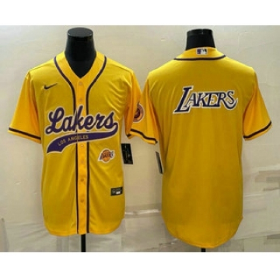 >Mens Los Angeles Lakers Yellow Big Logo With Cool Base Stitched Baseball Jersey