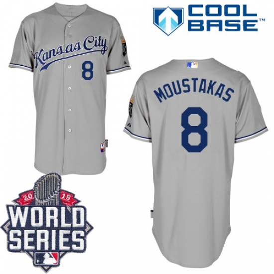Home>MLB>Kansas City Royals>Mike Moustakas>Men's Majestic Kansas City Royals #8 Mike Moustakas Replica Grey Road Cool Base 2015 World Series